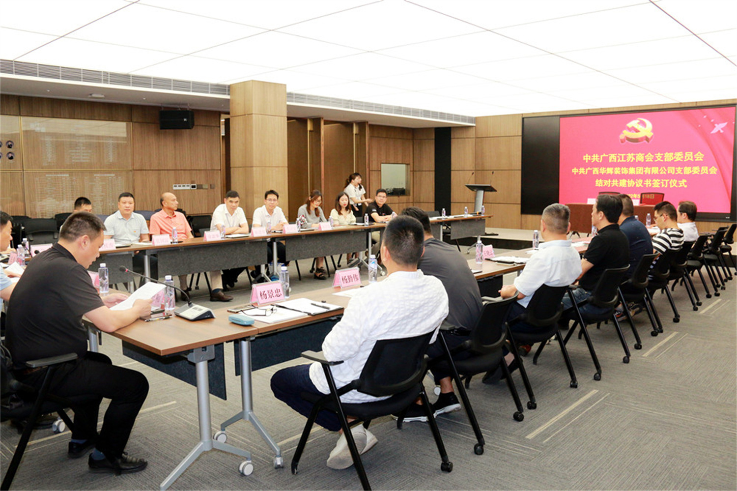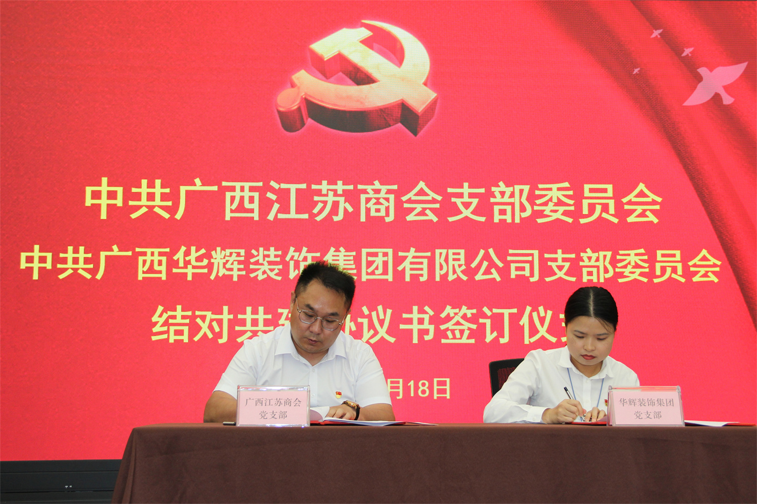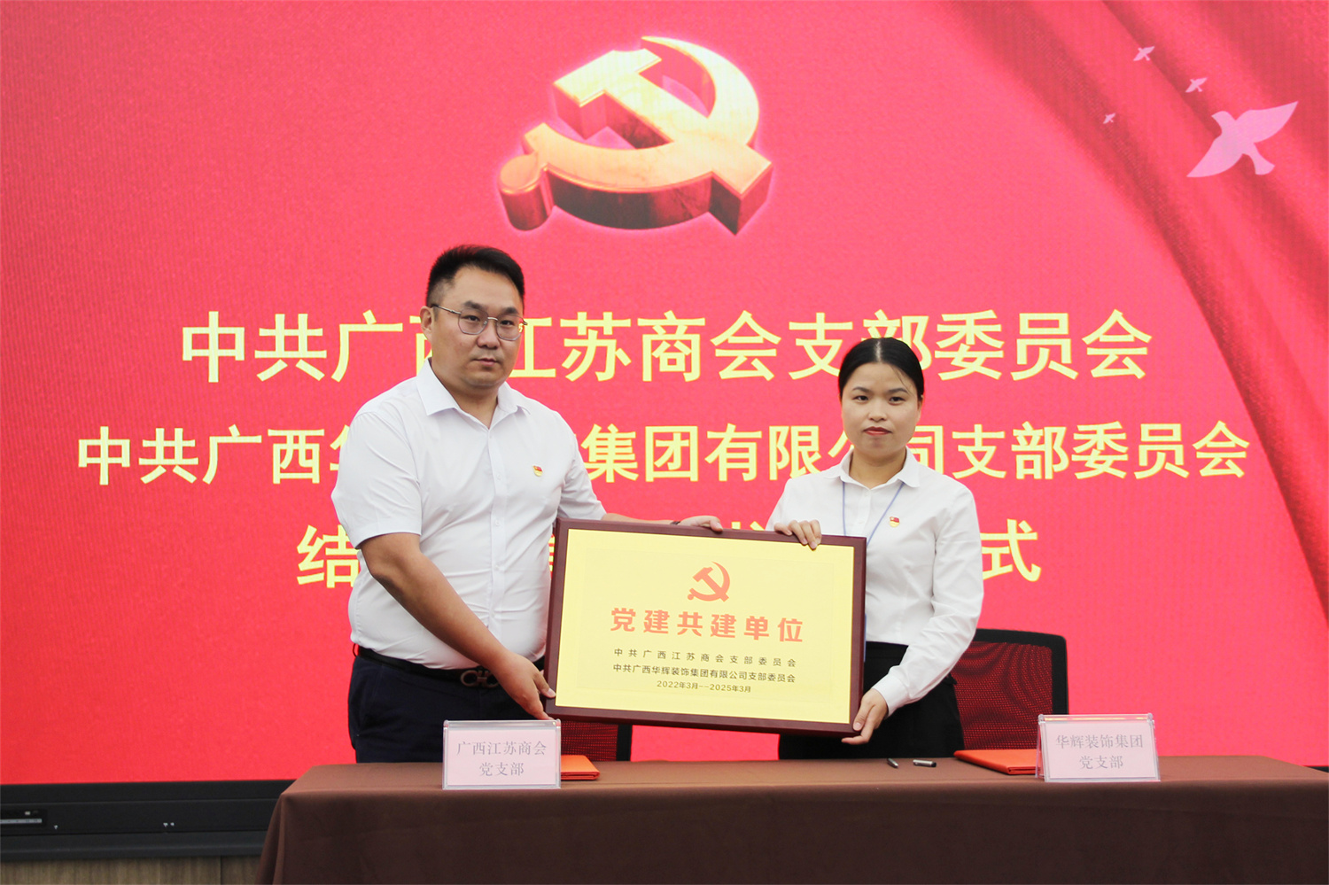 簽約儀式上,商會黨支部書記王偉、華輝裝飾集團黨支部書記劉萍東簽訂了結(jié)對共建協(xié)議,并由王偉同志代表廣西江蘇商會黨支部向廣西華輝裝飾集團有限公司黨支部贈牌。