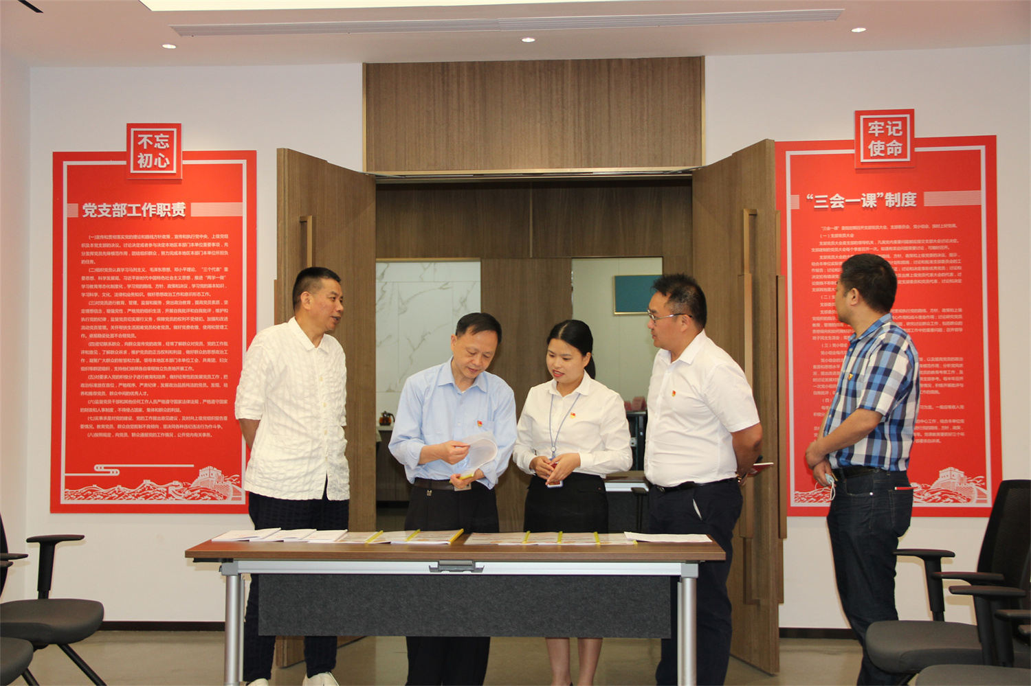 ▲李開剛(左二)查看華輝黨支部黨建工作臺賬
