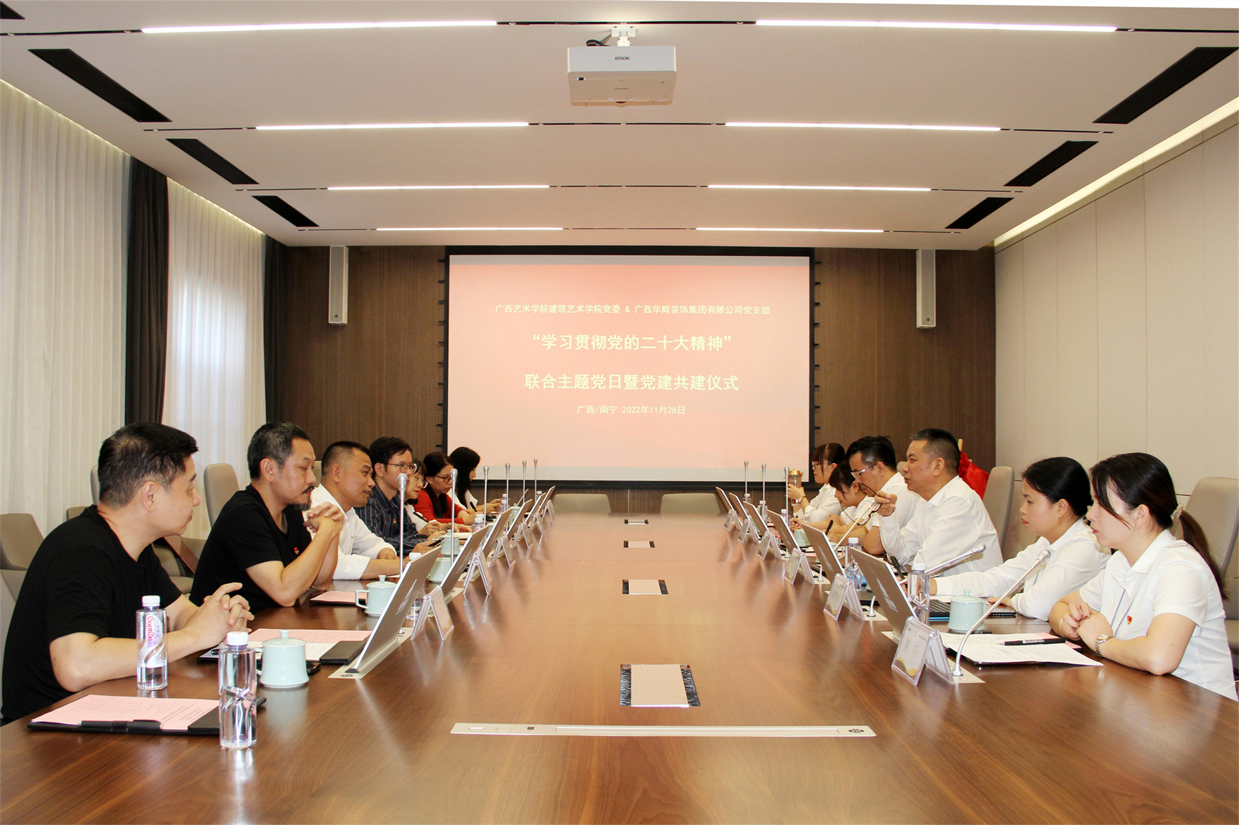 2022年11月28日,廣西藝術學院建筑藝術學院黨委與廣西華輝裝飾集團有限公司黨支部,開展“學習貫徹黨的二十大精神”聯(lián)合主題黨日暨黨建共建儀式;同時,廣西藝術學院建筑藝術學院與廣西華輝裝飾集團有限公司,舉行了“聯(lián)合共建校外實踐教育基地”揭牌儀式。