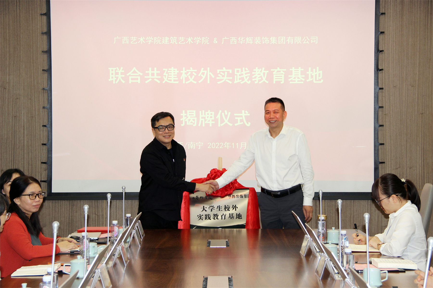 緊接著,廣西藝術(shù)學(xué)院建筑藝術(shù)學(xué)院院長林海、華輝裝飾集團董事長楊景忠,共同為“聯(lián)合共建校外實踐教育基地”揭牌。