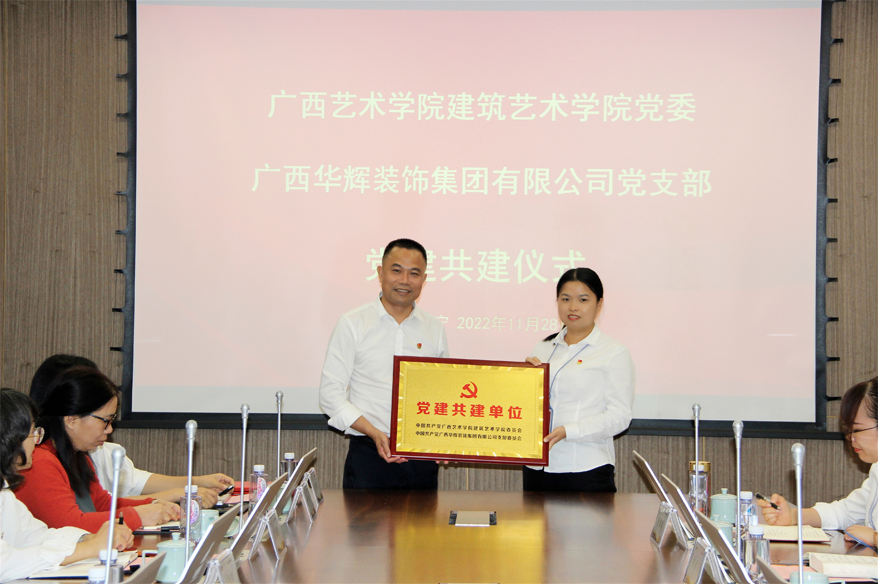 隨后,廣西藝術(shù)學(xué)院建筑藝術(shù)學(xué)院黨委書記馮鳳舉、華輝裝飾集團黨支部書記劉萍東簽訂了結(jié)對共建協(xié)議,并由馮鳳舉同志代表廣西藝術(shù)學(xué)院建筑藝術(shù)學(xué)院黨委向廣西華輝裝飾集團有限公司黨支部贈牌。