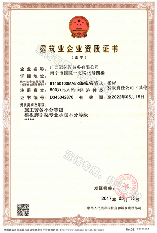 2017年5月15日,通過公司領(lǐng)導(dǎo)和同仁的努力,華輝集團(tuán)旗下廣西聚億匠勞務(wù)公司成功通過申報(bào)建筑業(yè)企業(yè)資質(zhì)證書的行政許可審查,取得該項(xiàng)資質(zhì)。