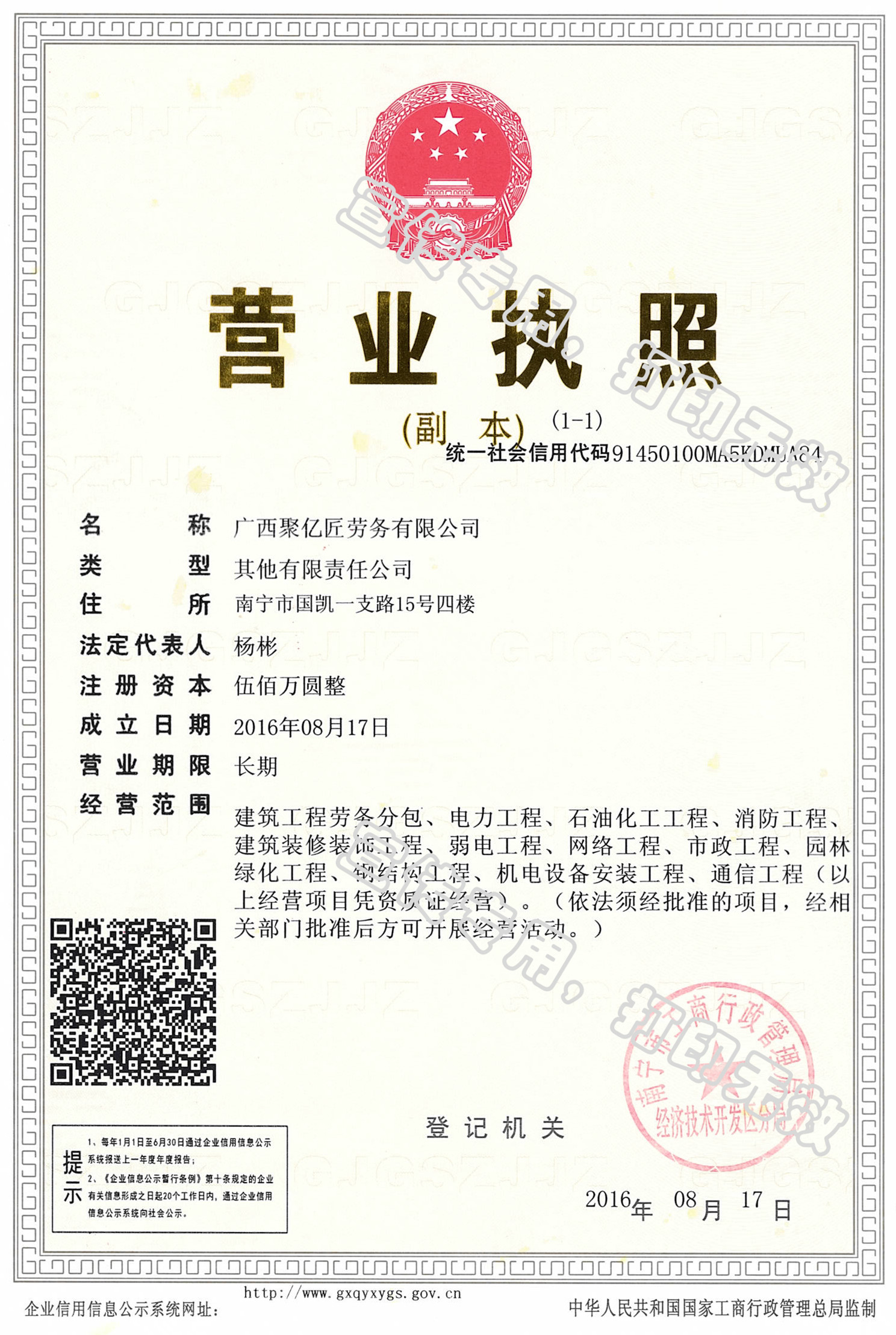 廣西聚億匠勞務(wù)有限公司成立于2016年8月17日,注冊(cè)資金500萬元,系華輝集團(tuán)旗下主要從事建筑工程勞務(wù)分包、建筑裝修裝飾工程、電力工程等業(yè)務(wù)的現(xiàn)代企業(yè)。