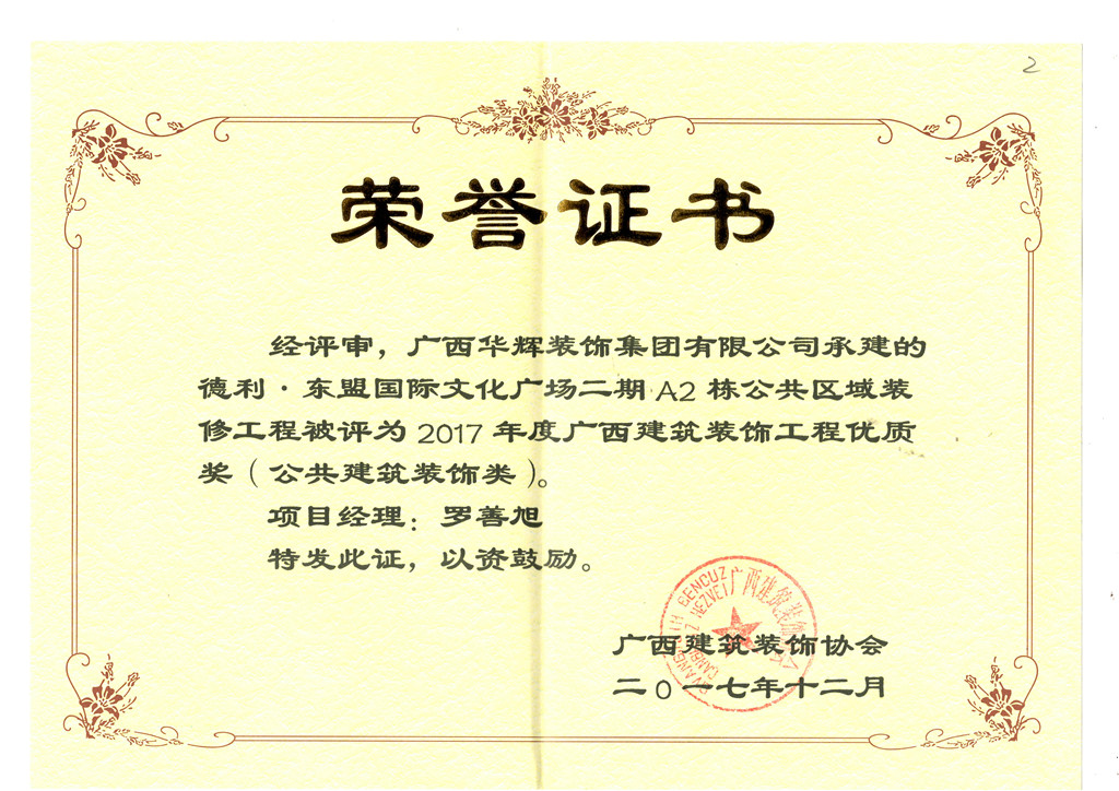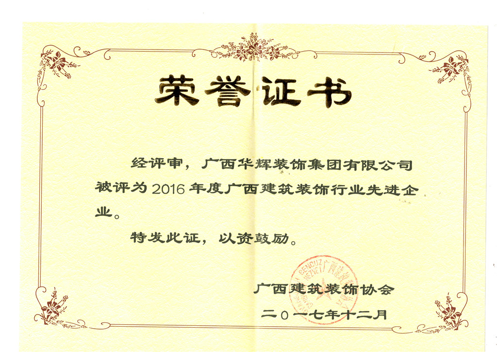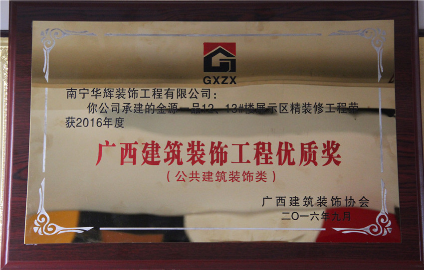 12月,華輝集團(tuán)獲得了“2017年度廣西建筑裝飾工程優(yōu)質(zhì)獎(jiǎng)(公共建筑裝飾類)”、“2016年度廣西建筑裝飾行業(yè)先進(jìn)企業(yè)”、“2016年度廣西建筑裝飾行業(yè)優(yōu)秀企業(yè)經(jīng)理”及“2016年度廣西建筑裝飾行業(yè)優(yōu)秀建筑裝飾設(shè)計(jì)師”榮譽(yù)稱號。
