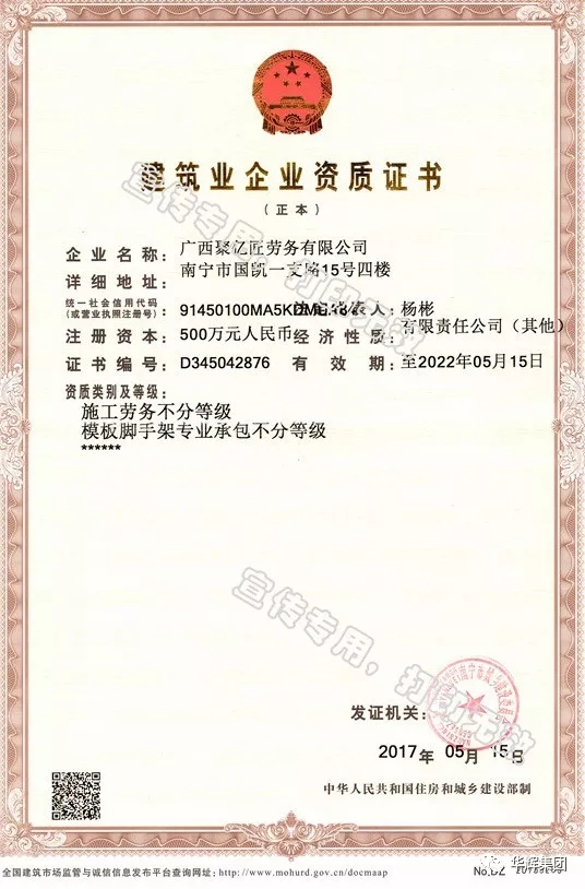 5月,華輝旗下廣西聚億匠勞務(wù)公司成功申報(bào)建筑業(yè)施工勞務(wù)資質(zhì)。