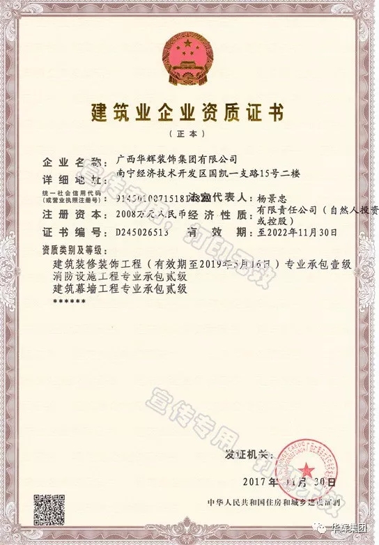 12月,華輝集團(tuán)喜獲建筑消防設(shè)施工程專業(yè)承包貳級、建筑幕墻工程專業(yè)承包貳級的資質(zhì)。