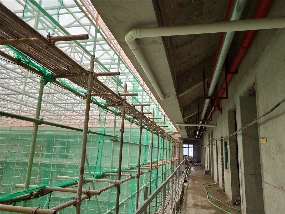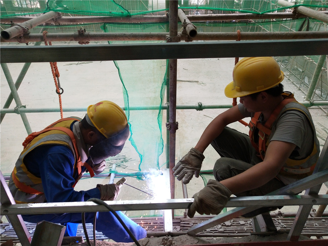 ▲焊工作業(yè)人員全部武裝上陣認真焊接中庭延伸走廊鋼結(jié)構(gòu)工程