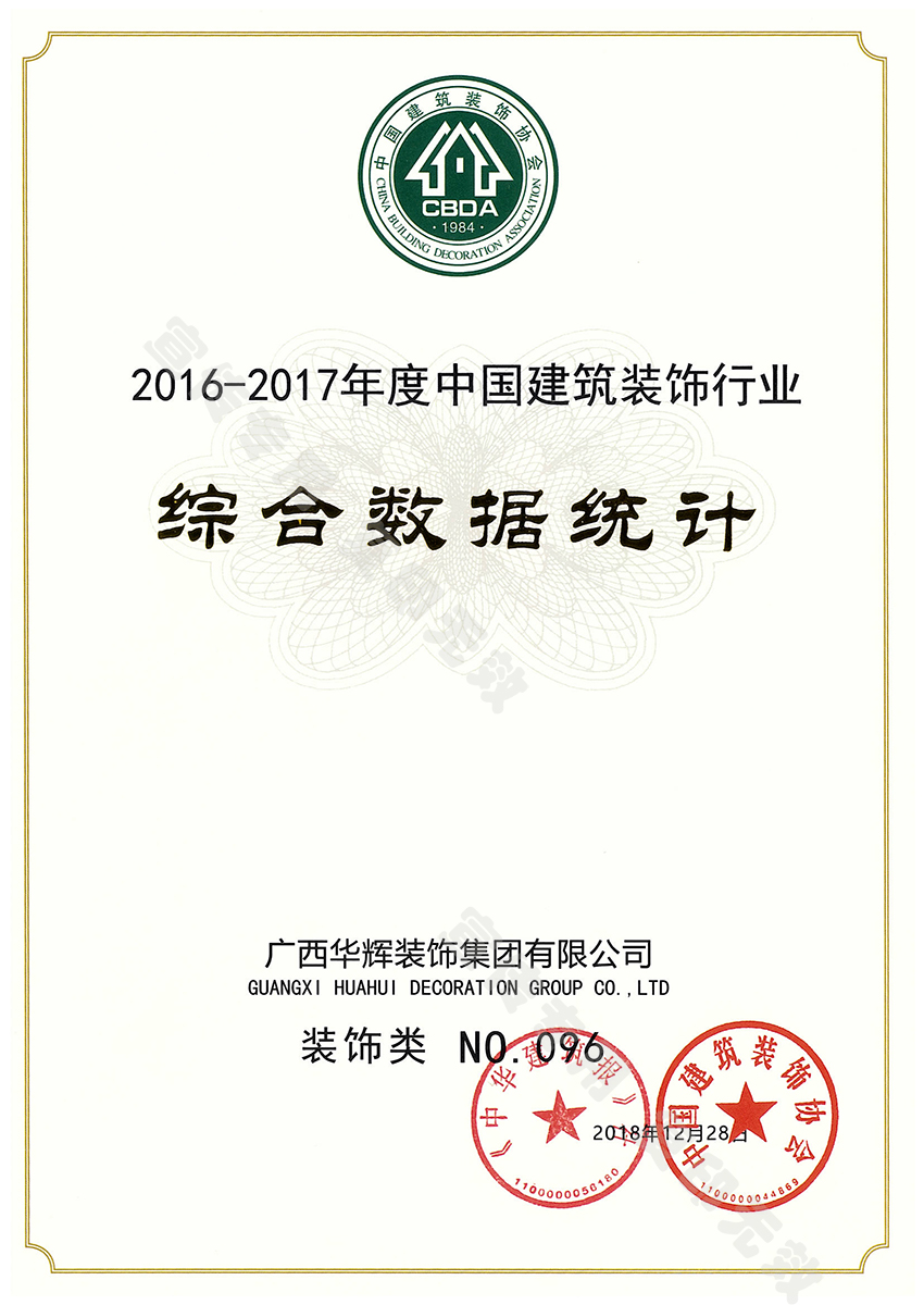 2019年1月9日,2016-2017年度中國建筑裝飾行業(yè)綜合數(shù)據(jù)統(tǒng)計(jì)結(jié)果揭曉,華輝裝飾集團(tuán)憑借強(qiáng)勁的綜合實(shí)力,先進(jìn)的施工技藝,優(yōu)秀的管理能力,榮獲中國建筑裝飾行業(yè)百強(qiáng)企業(yè)。
