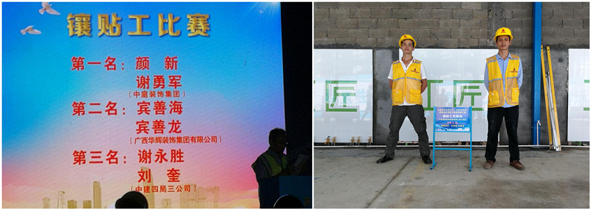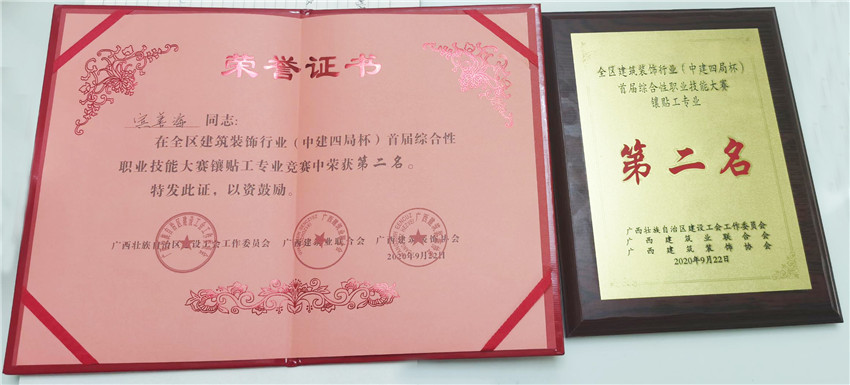 經(jīng)過(guò)激烈的比賽角逐,華輝裝飾集團(tuán)代表隊(duì)的兩名選手賓善海、賓善龍,憑借著深厚的技術(shù)素養(yǎng)、穩(wěn)定的賽場(chǎng)發(fā)揮,榮獲鑲貼工比賽亞軍;代表隊(duì)榮獲團(tuán)體獎(jiǎng)第六名。