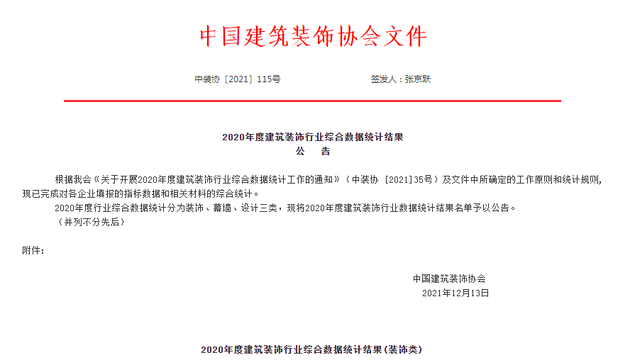 “中國建筑裝飾行業(yè)綜合數(shù)據(jù)統(tǒng)計工作”是由中國建筑裝飾協(xié)會主辦,采用市場評價的方式,通過嚴(yán)格審查參評企業(yè)年度的各項數(shù)據(jù),測評企業(yè)財務(wù)年度指標(biāo)、質(zhì)量技術(shù)指標(biāo)、人力資源指標(biāo),企業(yè)年度各類工程的獲獎情況,專利情況,嚴(yán)格參照國家標(biāo)準(zhǔn)、行業(yè)標(biāo)準(zhǔn)、地方標(biāo)準(zhǔn)進(jìn)行層層測評,分為裝飾類、幕墻類、設(shè)計類三項,受到業(yè)界的廣泛認(rèn)可。