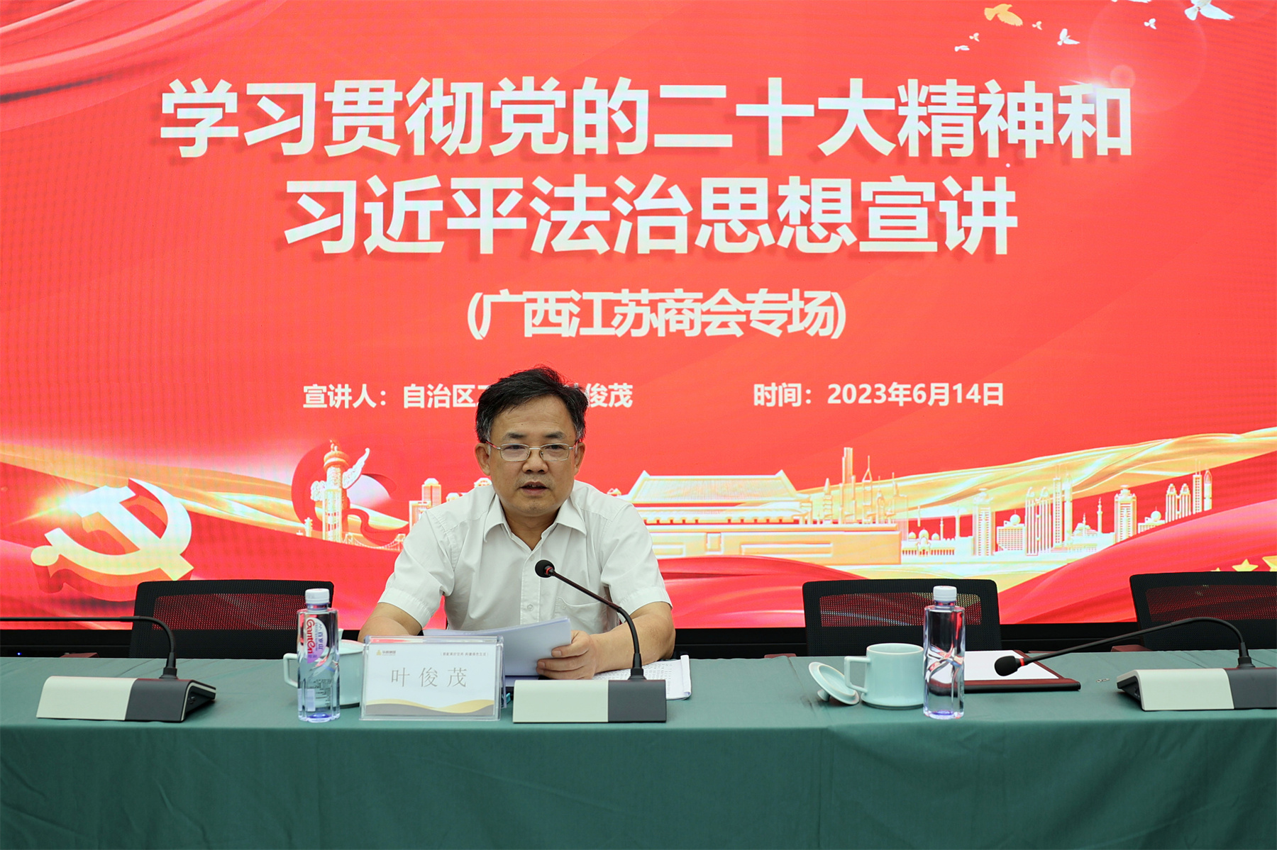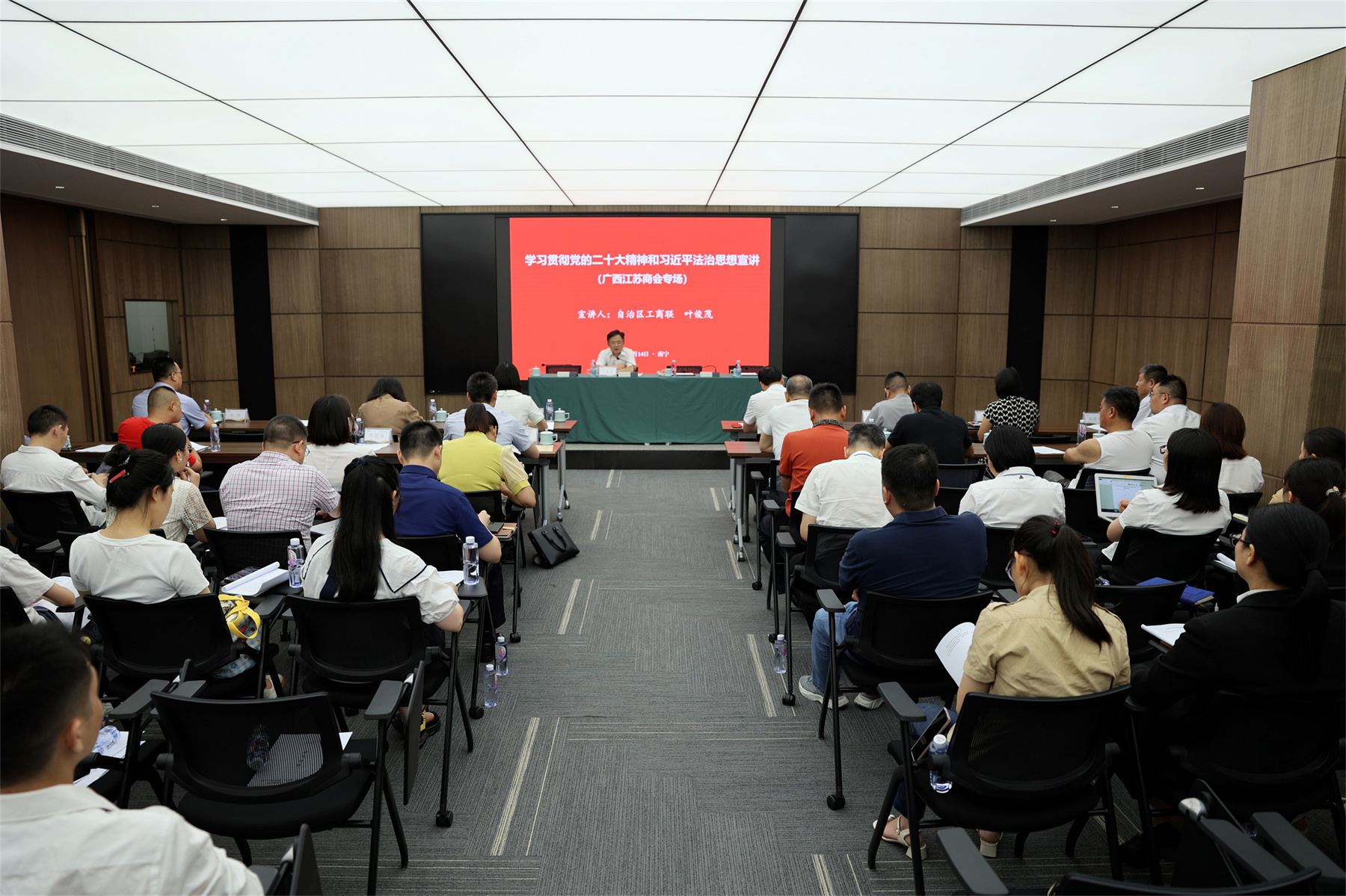 2023年6月14日,自治區(qū)工商聯(lián)2023年“法律進商會”“法律進民營企業(yè)”暨防范非法集資宣傳活動,在廣西華輝裝飾集團舉行。自治區(qū)工商聯(lián)副主席葉俊茂出席活動并作學(xué)習(xí)貫徹黨的二十大精神和習(xí)近平法治思想宣講。集團董事長楊景忠率公司管理人員及員工代表參加了活動。