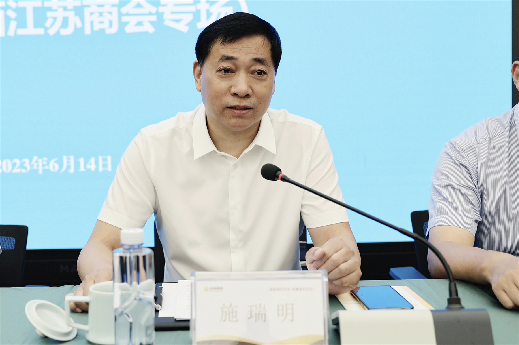 ▲自治區(qū)工商聯(lián)副主席葉俊茂與廣西江蘇商會會長施瑞明、執(zhí)行會長楊景忠,親切交流