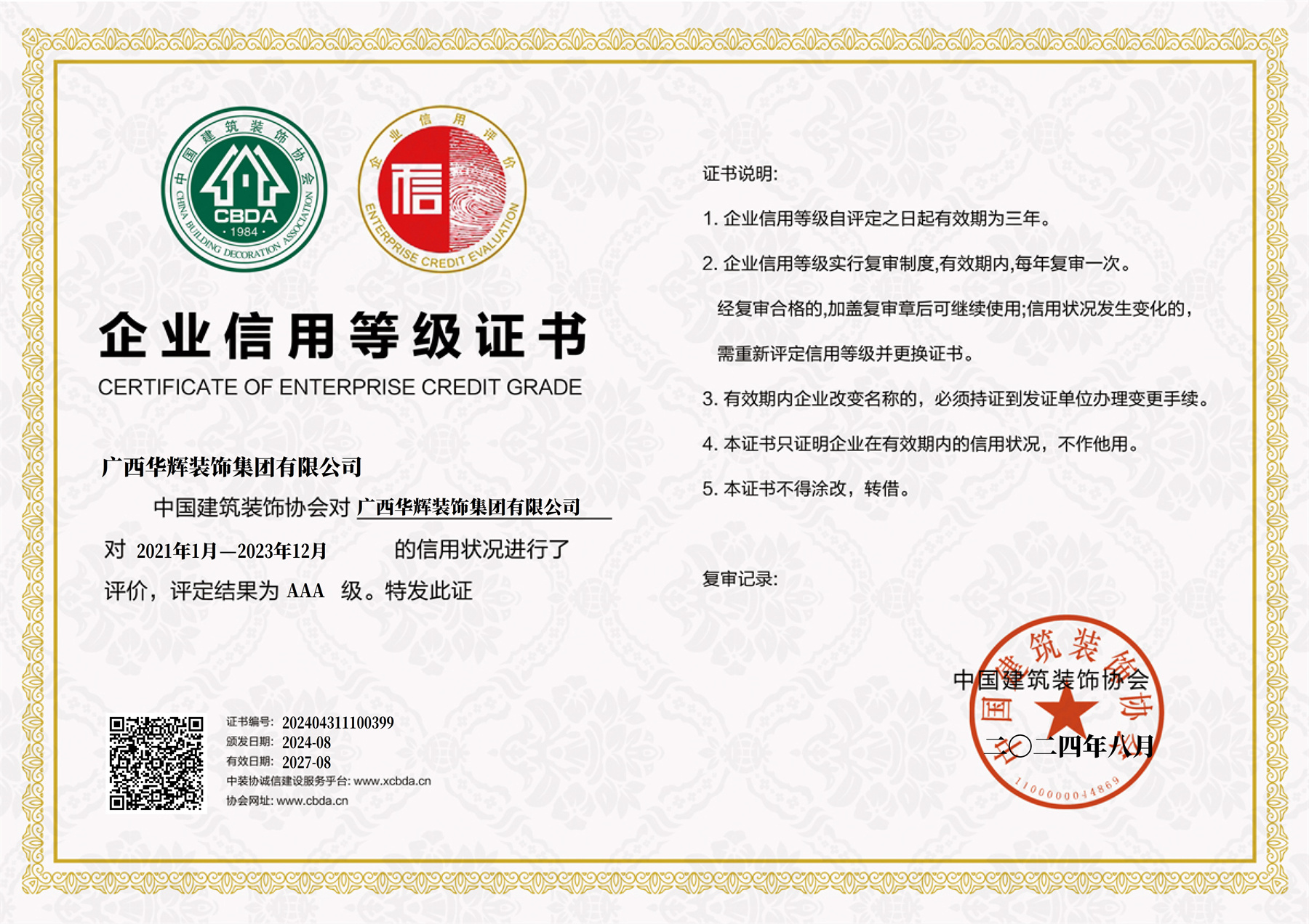 近日,華輝憑借多年來(lái)堅(jiān)持誠(chéng)信經(jīng)營(yíng)、良好履約,再度獲評(píng)中國(guó)建筑裝飾行業(yè)企業(yè)信用AAA級(jí)(最高級(jí))評(píng)價(jià),這是華輝連續(xù)6年獲評(píng)該項(xiàng)信用等級(jí)。
