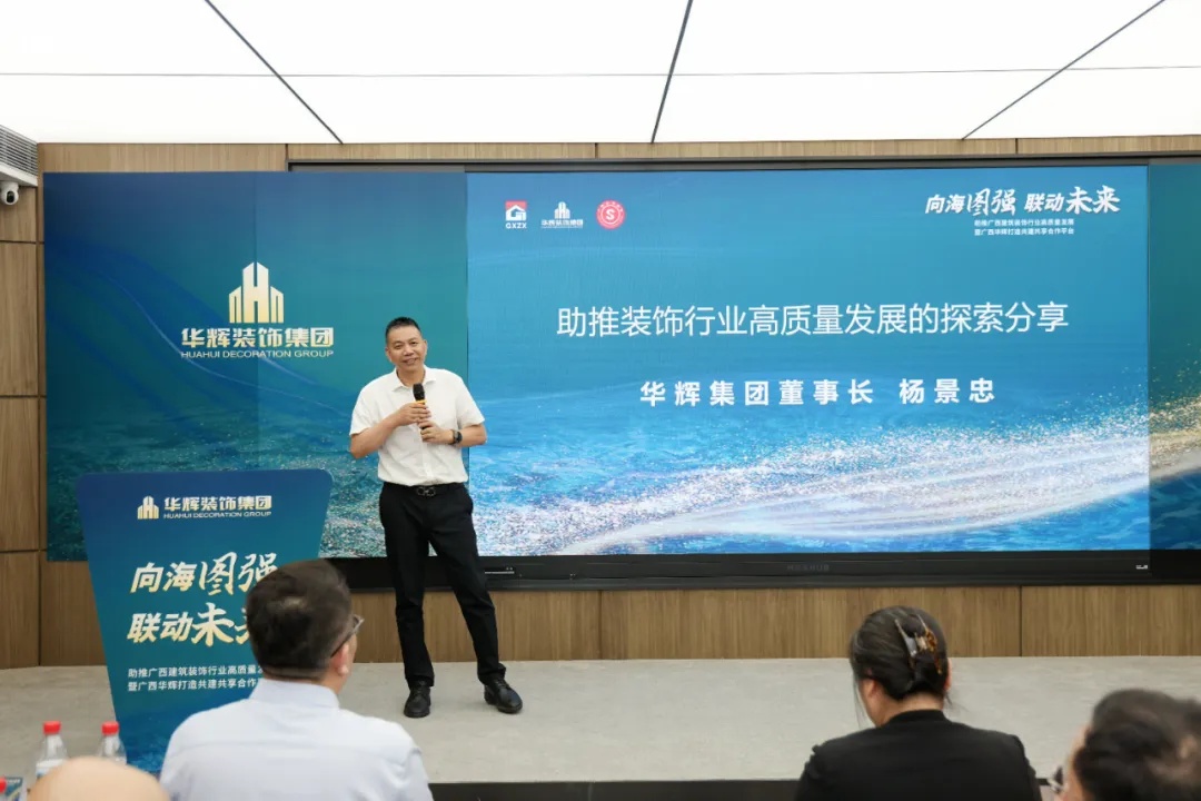 華輝裝飾集團(tuán)董事長(zhǎng)楊景忠以深邃的行業(yè)洞察和豐富的實(shí)踐經(jīng)驗(yàn),向與會(huì)嘉賓分享了華輝在助推裝飾行業(yè)高質(zhì)量發(fā)展方面的積極探索。楊景忠指出,裝飾行業(yè)正處在一個(gè)關(guān)鍵的創(chuàng)新升級(jí)期,隨著人們生活水平的提高,人們對(duì)品質(zhì)、美學(xué)的要求越來(lái)越高,裝飾行業(yè)也會(huì)不斷有新的需求市場(chǎng)。未來(lái)裝企的三條路是向海圖強(qiáng)——出海、搭建平臺(tái)、依托平臺(tái),華輝致力于打造廣西裝飾行業(yè)的“共建共享合作平臺(tái)”,利用華輝25年的優(yōu)勢(shì)和經(jīng)驗(yàn),賦能行業(yè),與行業(yè)企業(yè)攜手共進(jìn),共同應(yīng)對(duì)市場(chǎng)挑戰(zhàn),實(shí)現(xiàn)行業(yè)的可持續(xù)發(fā)展。