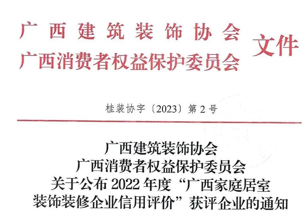 2023年2月2日,廣西建筑裝飾協(xié)會(huì)、廣西消費(fèi)者權(quán)益保護(hù)委員會(huì)聯(lián)合發(fā)布通知,評(píng)選出符合“廣西家庭居室裝飾裝修企業(yè)信用評(píng)價(jià)”AAA級(jí)資格標(biāo)準(zhǔn)的企業(yè)共6家,廣西華輝裝飾集團(tuán)有限公司為獲評(píng)企業(yè)之一。